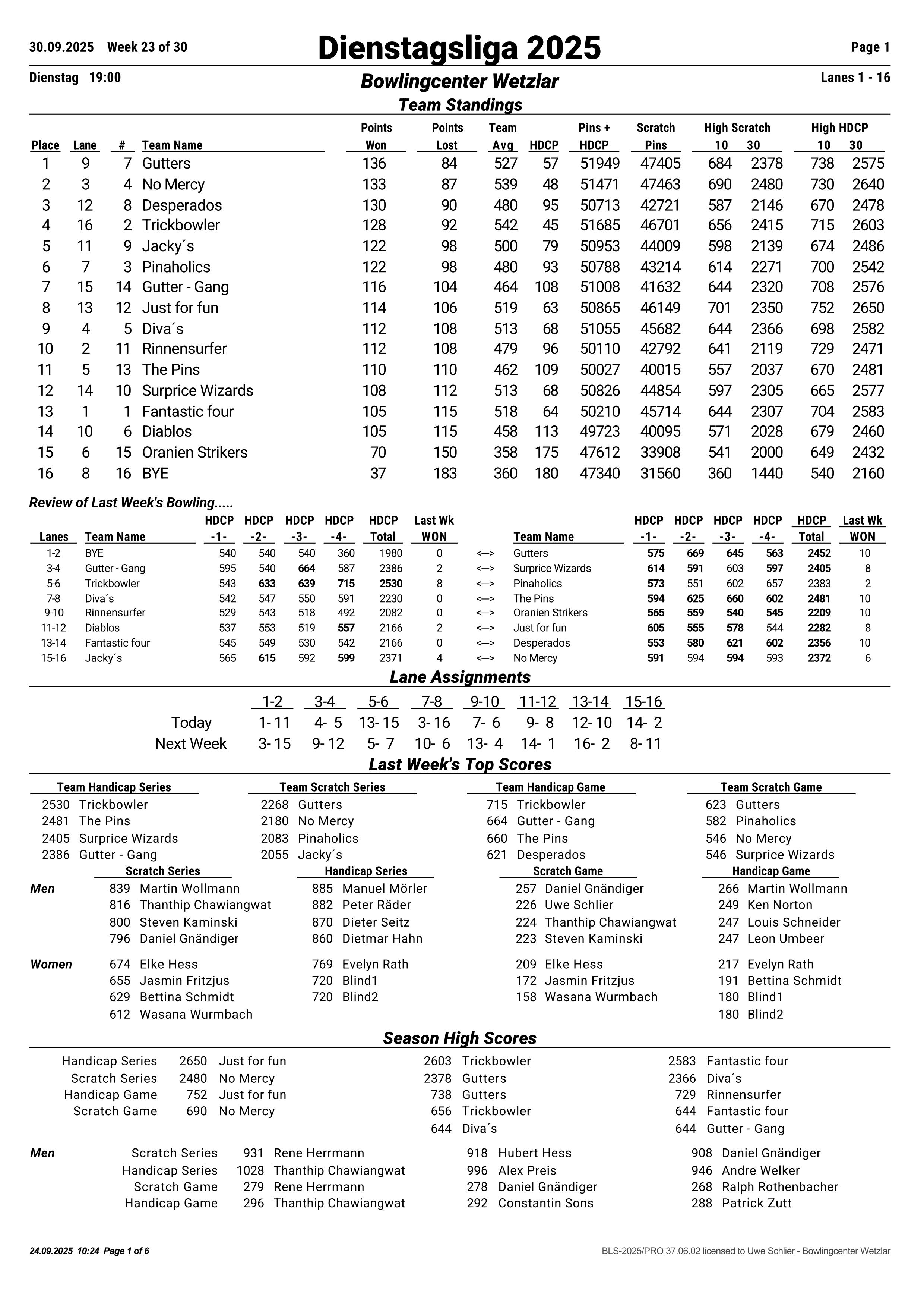 24 Spieltag 785 Pin, Schnitt von 196,2 Pin, Höhstes Spiel 212 Pin